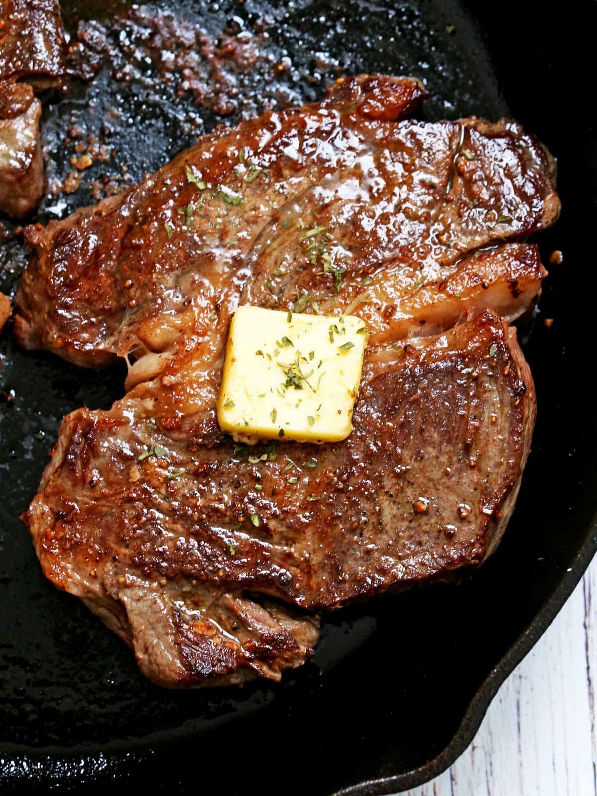 - Remove the steaks to heated plates, cover them loosely, and let them rest for 5 minutes. Top with butter and serve.