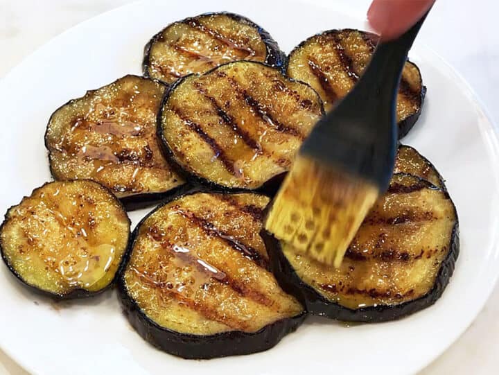 - Brush the eggplant slices with the mixture on both sides. Set aside any remaining marinade.