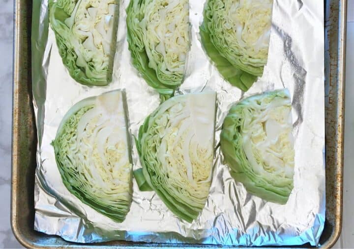 - Rinse the cabbage wedges, then carefully dry them using paper towels. Place the wedges in a single layer on the prepared baking sheet.
